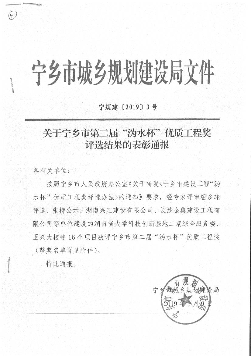 關(guān)于寧鄉(xiāng)市第二屆“溈水杯”優(yōu)質(zhì)工程獎評選結(jié)果的表彰通報