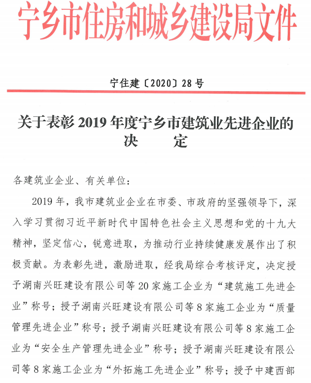 關(guān)于表彰2019年度寧鄉(xiāng)市建筑業(yè)先進(jìn)企業(yè)的決定